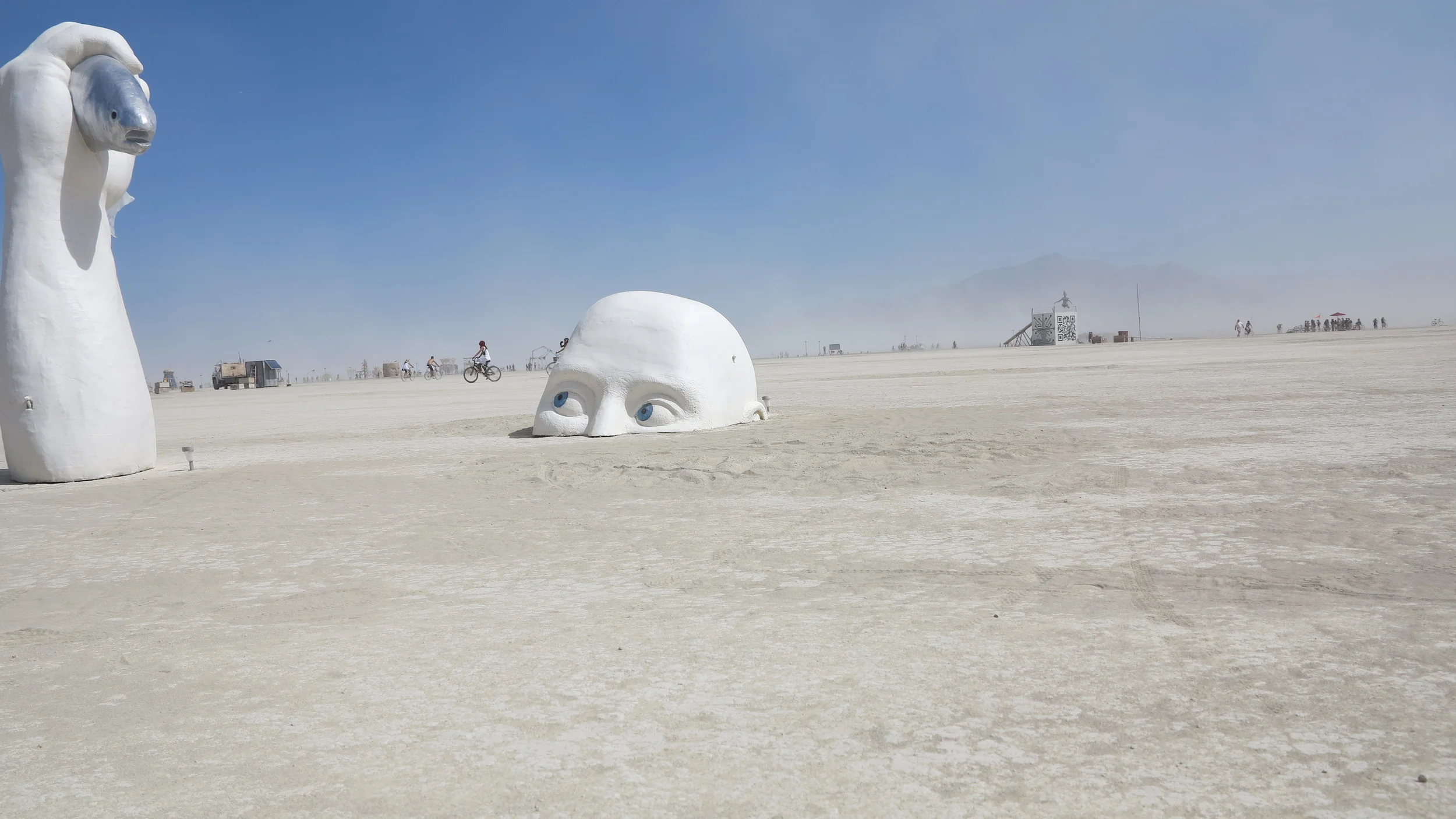 We had read a tonne of stuff on the Burning Man site and forum about queuing times into the event. It can reach 8-10 hours (despite massive improvements this year apparently). By Tuesday it had eased down to 3 hours or so. Any amount of time can feel tough waiting in line in either direction. Vehicles kick up dust so you have to shut down the aircon, block the vents and sweat it out. Added to that we arrived in a dust storm so couldn't see 10 feet in front. We had to frequently stop or crawl along trying our best not to hit anything. After getting our vehicle searched for stowaways we then met the gate greeters. I loved the 'Welcome Home' greeting you get from them. It was only later that I fully grasped it's meaning but it was still cool at the time. What wasn't so cool was then being asked to get down in the dust and take a dust-bath. By this point we were so hot and sweaty that the dust was instantly sticking to our skin, our mouths were so parched we could hardly talk and now apparently we had to get down and love the stuff. When I declined I was told,