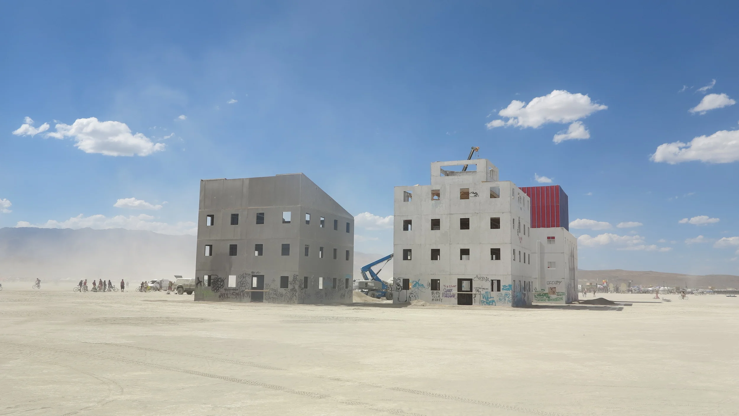 Of course we did. We jumped in and off we went until we reached the open Playa. The weather on The Playa was drastically different from the more sheltered streets and the dust was now kicking up like whirling dervishes in every direction. It was an even more dramatic way to see the sights of Black Rock City for the first time because they emerged out of the off-white clouds only when we were close enough to be totally blown away by their sheer scale. I had no idea how our driver Kay was finding his way around but he managed to pick out The Man, The Temple of Juno and Burn Wall Street through the storm. He laughed hysterically as he drove which was totally infectious. We got talking and I found out that he had been to Burning Man many times. He had built the car with his son, who was also there, and he had Leukemia. I'm not sure if I'll ever see him again or if he'll even be alive for the next burn but he was certainly someone I will remember and the first person to show me The Playa.